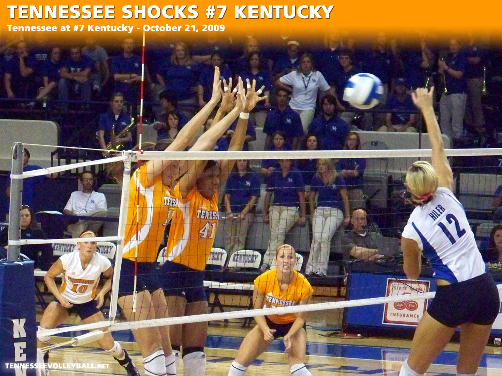 UPDATE: My nerves are frazzled, but what a great match! Despite the closeness of the score it was UK who had to play catch up almost the entire time — including the set they won! Check out the full stories from Tennessee and Kentucky. Nikki Fowler gets her fourth double-double in a row with 20 kills and 17 digs, and also had 4 blocks. Kayla Jeter had 14 kills, 2 aces, and 3 blocks — and just 1 error on 40 attacks! Chloe Goldman had 23 digs. Kylie Marshall had 7 kills and 9 digs. Leah Hinkey had 5 kills and 6 blocks while Leslie Cikra had 6 kills and 2 blocks. Farren Powe added in 4 more blocks. Emily Steinbeck had 22 assists. And Kelsey Mahoney had 2 aces, 27 assists, and 2 really nice kills of her own!